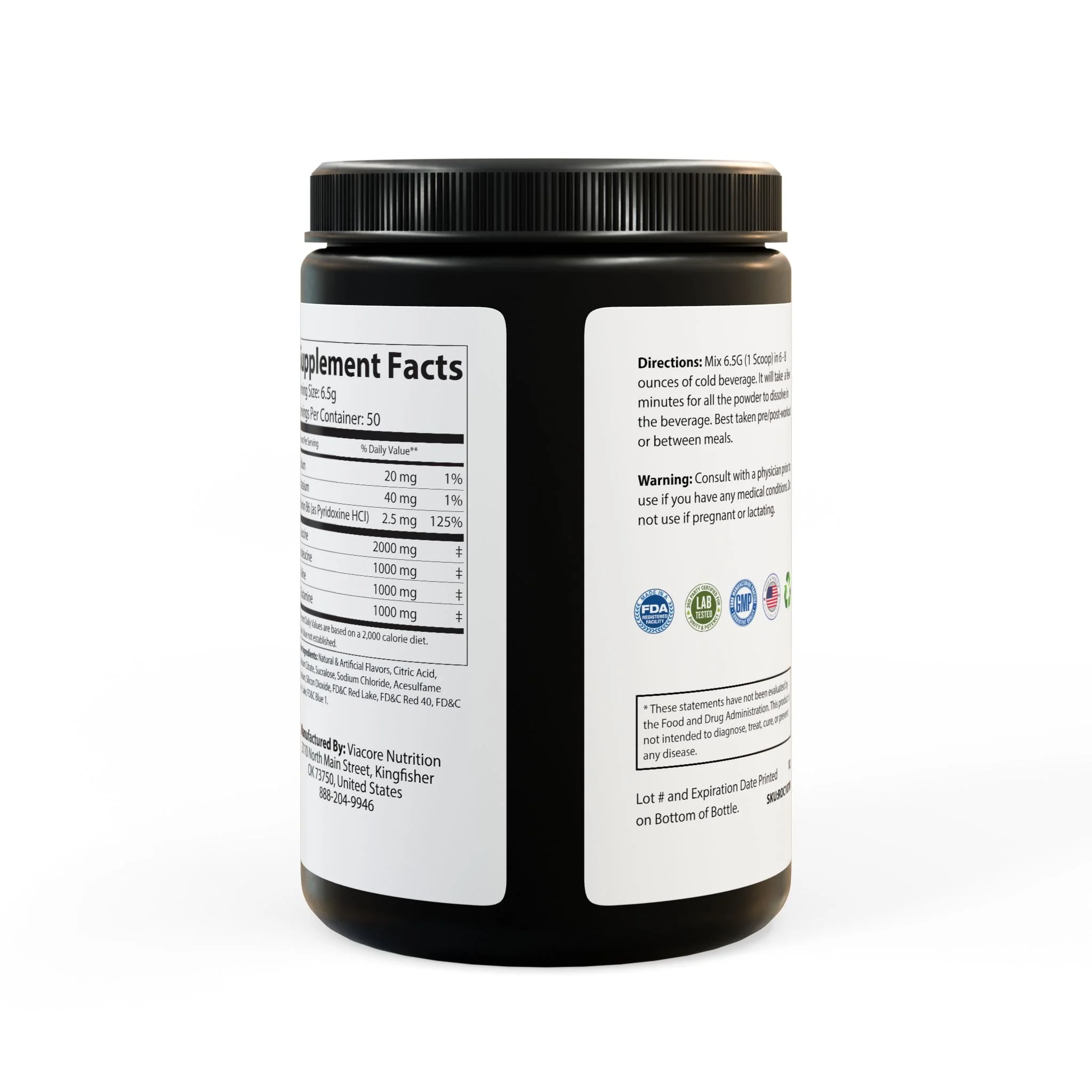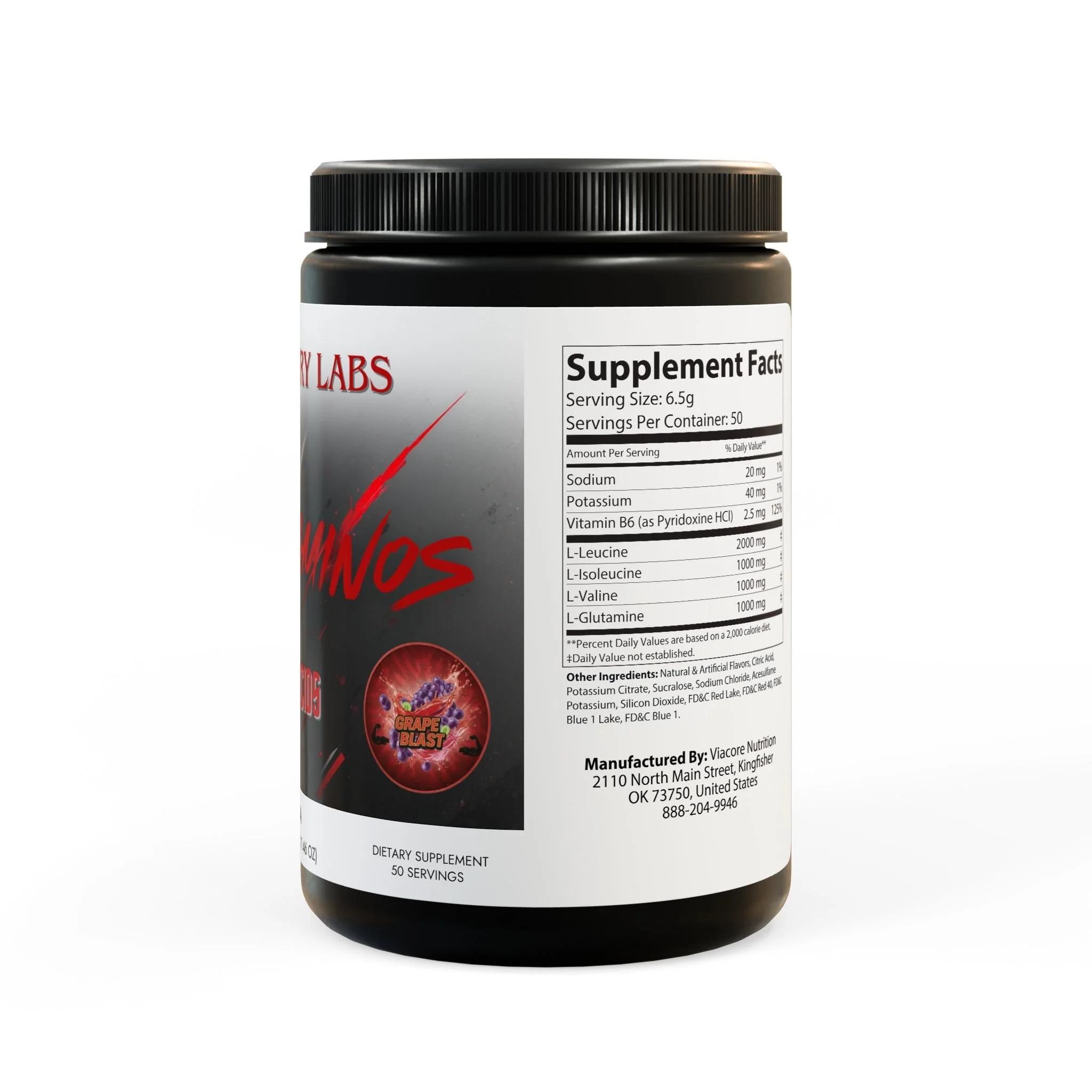 Key ingredients include Sodium, Potassium, Vitamin B6 (as Pyridoxine HCl), L-Leucine, L-Isoleucine, L-Valine, and L-Glutamine.