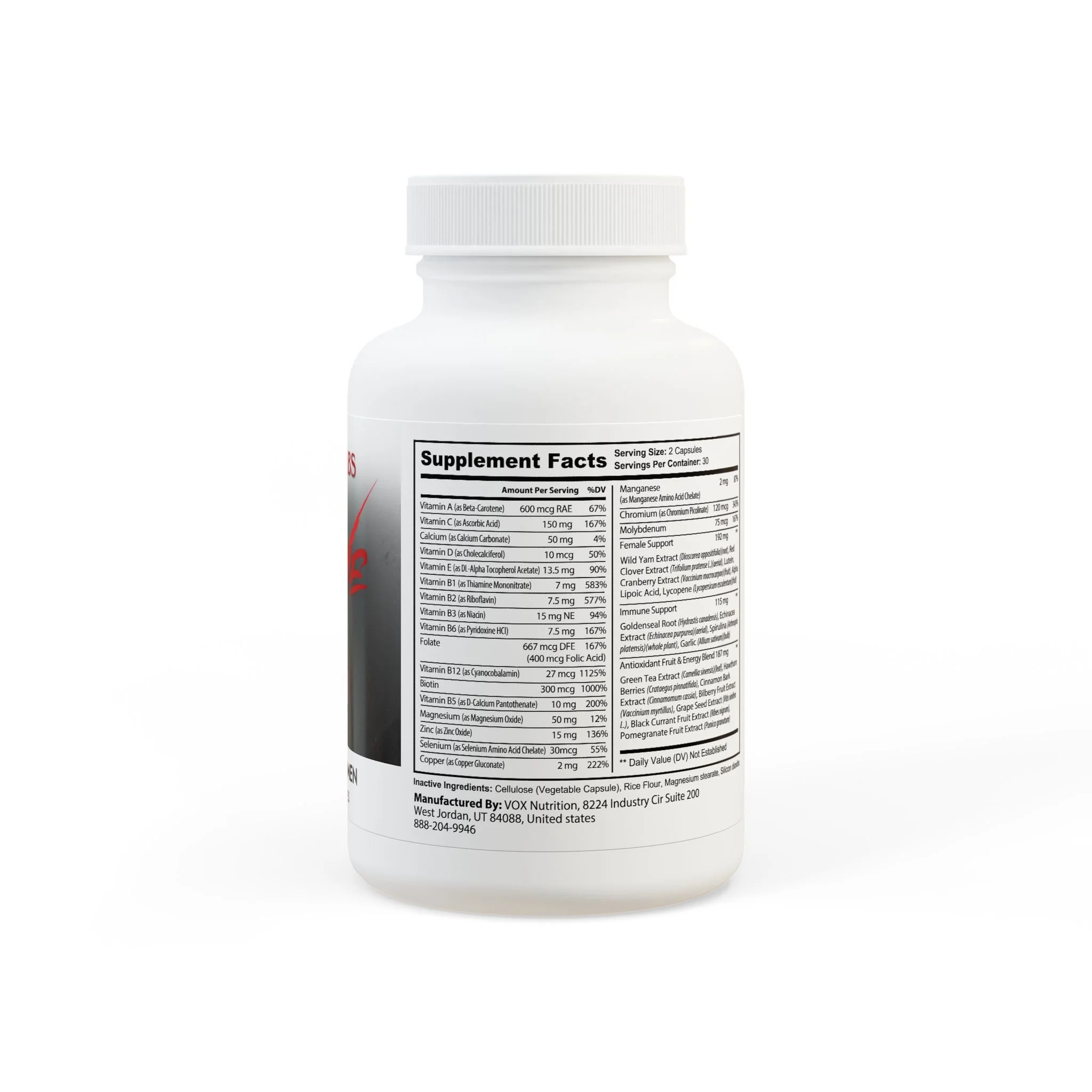 Ingredients: Vitamin A (as Beta-Carotene), Vitamin C (as Ascorbic Acid), Calcium (as Calcium Carbonate), Vitamin D (as Cholecalciferol), Vitamin E (as DL-Alpha Tocopherol Acetate), Vitamin B1 (as Thiamine Mononitrate), Vitamin B2 (as Riboavin), Vitamin B3 (as Niacin), Vitamin B6 (as Pyridoxine HCI), Folate (400 mcg Folic Acid), Vitamin B12 (as Cyanocobalamin), Biotin, Vitamin B5 (as D-Calcium Pantothenate), Magnesium (as Magnesium Oxide), Zinc (as Zinc Oxide), Selenium (as Selenium Amino Acid Chelate), Copper (as Copper Gluconate), Manganese (as Manganese Amino Acid Chelate), Chromium (as Chromium Picolinate), Molybdenum, Wild Yam Extract (Dioscorea oppositifolia)(root), Red Clover Extract (Trifolium pratense L.)(aerial), Lutein, Cranberry Extract (Vaccinium macrocarpon)(fruit), Alpha Lipoic Acid, Lycopene (Lycopersicum esculentum (fruit), Goldenseal Root (Hydrastis canadensis), Echinacea Extract (Echinacea purpurea)(aerial), Spirulina (Arthrospira platensis)(whole plant), Garlic (Allium sativum)(bulb), Green Tea Extract (Camellia sinensis)(leaf), Hawthorn Berries (Crataegus pinnatida), Cinnamon Bark Extract (Cinnamomum cassia), Bilberry Fruit Extract (Vaccinium myrtillus), Grape Seed Extract (Vitis vinifera L.), Black Currant Fruit Extract (Ribes nigrum), Pomegranate Fruit Extract (Punica granatum). Inactive Ingredients: Cellulose (Vegetable Capsule), Rice Flour, Magnesium stearate, Silicon dioxide.